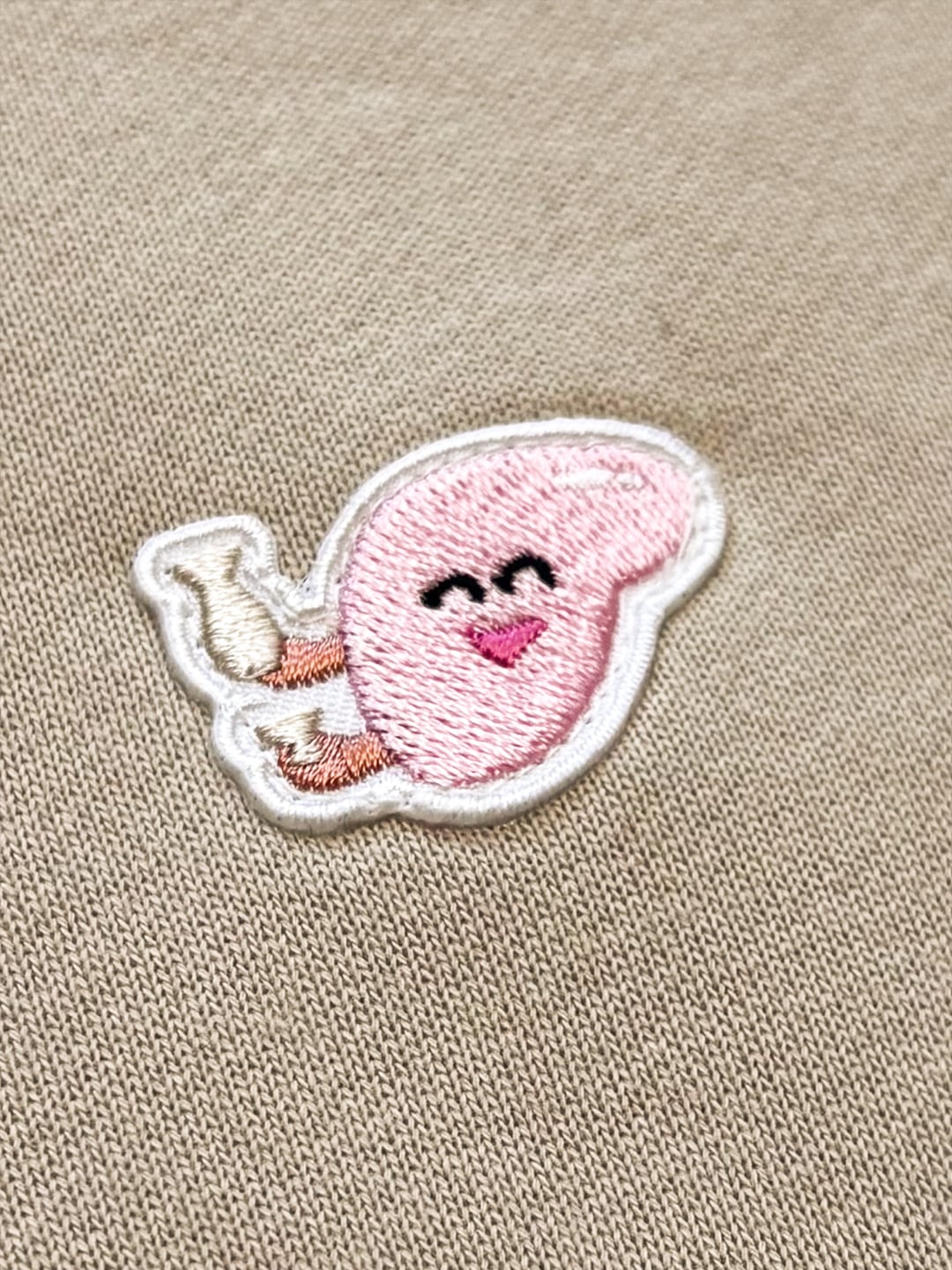 肝臓くんのワッペンが心臓近くに付いているTシャツ。
