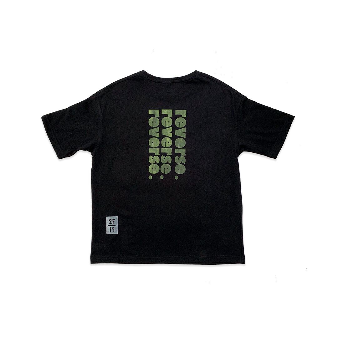 フロントにイラスト、バックに「reverse.」の3連プリントが入る2F(ツーフー)のTシャツ。