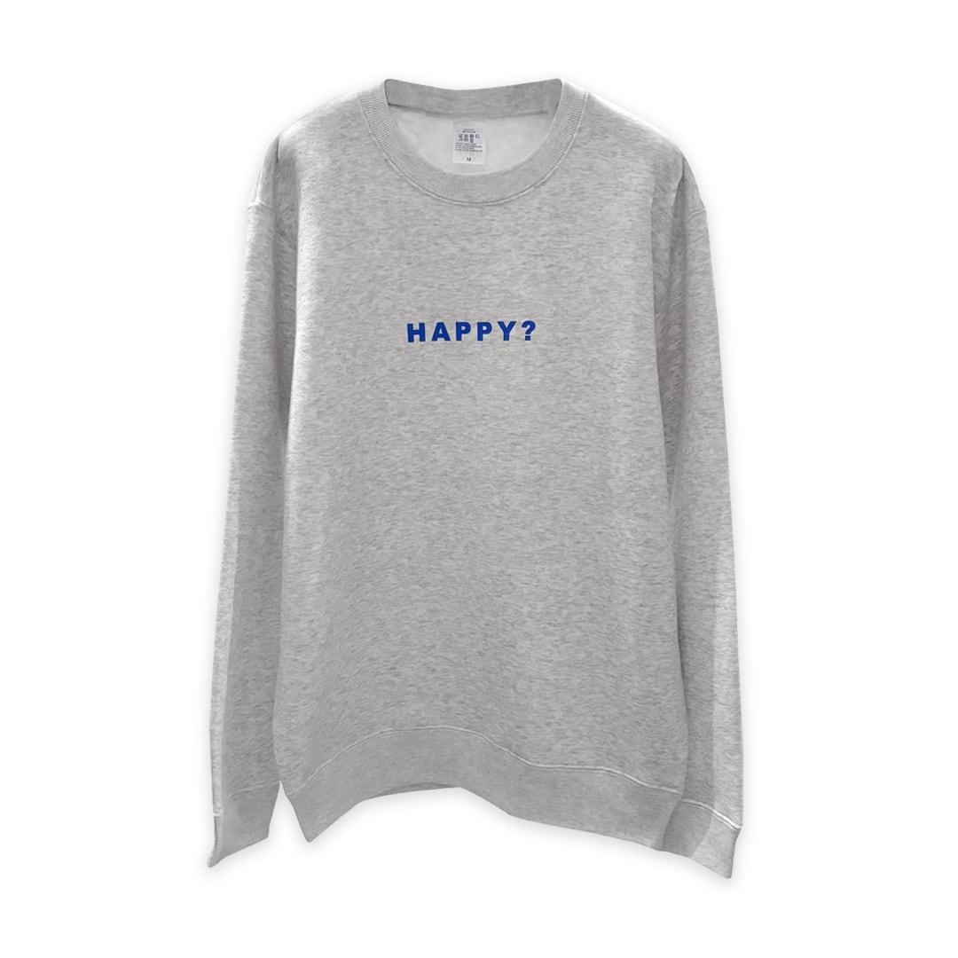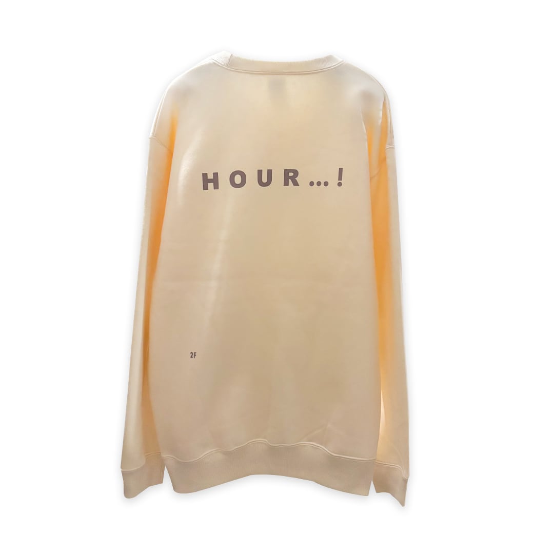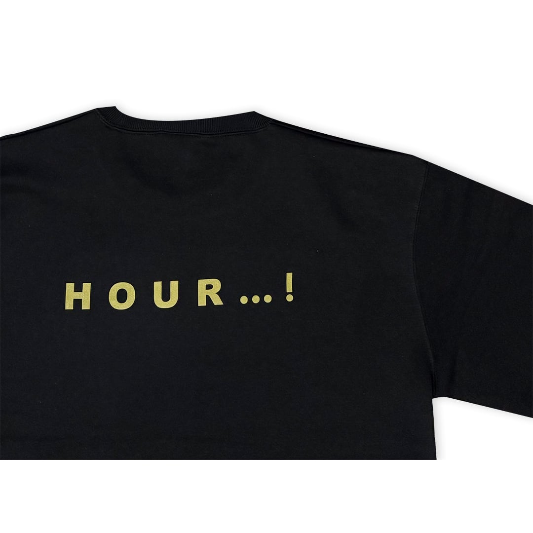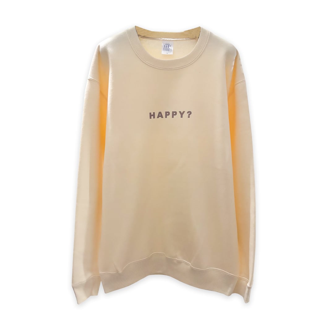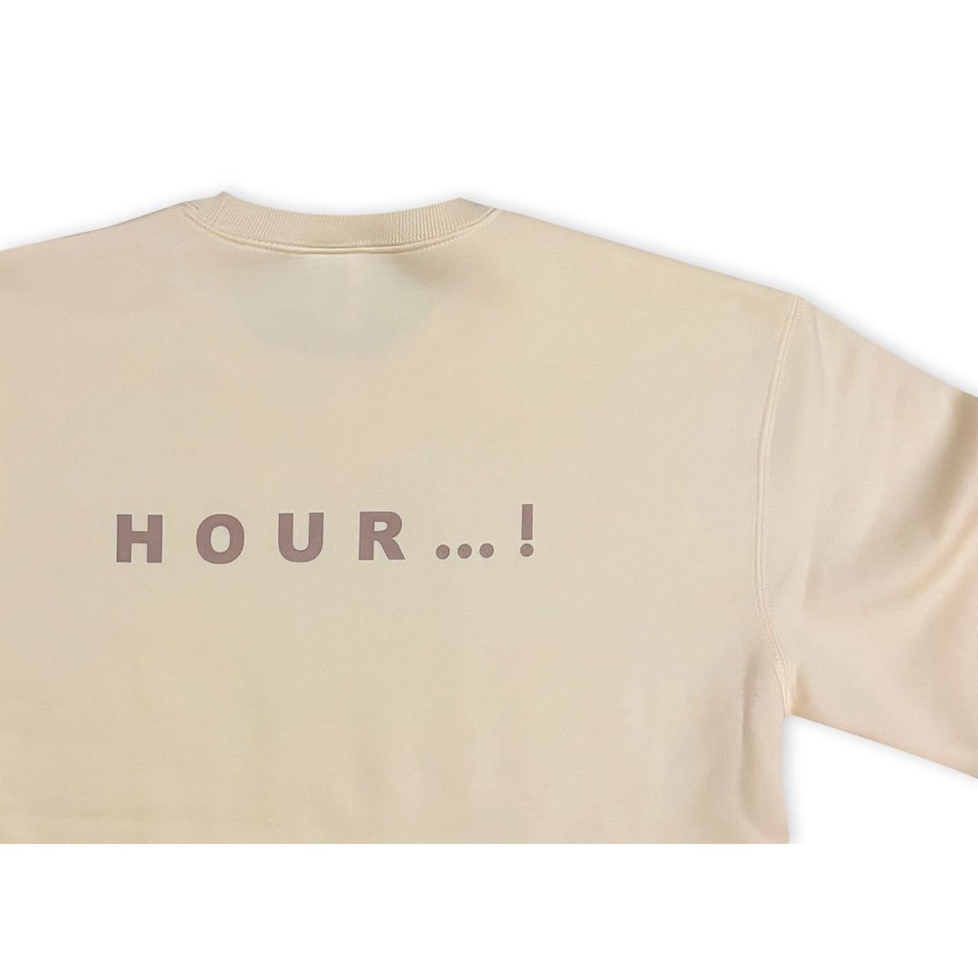 フロントに「HAPPY?」、バックに「HOUR..!」とプリントされたスウェット。